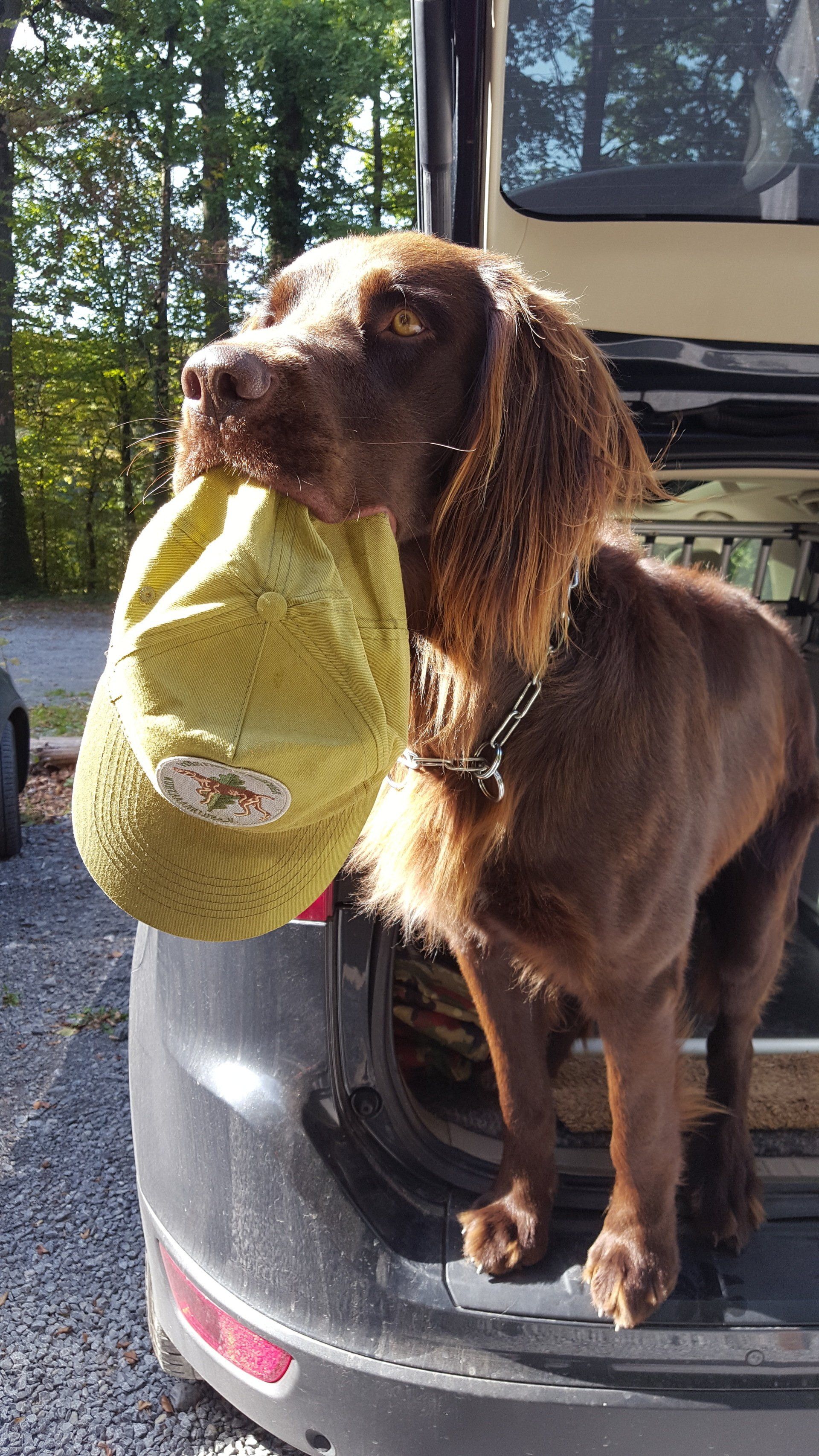 Wir dislozierten für die weiteren Übungen: Feldsuche. Endlich konnte ich mich austoben. Leider war nichts drin, der Hase hat sich vorher schon verabschiedet. Hätte gerne gezeigt, dass ich den Gehorsam auf Haarwild auch habe (haben ja genug In Österreich geübt). Anschließend kam das Vorstehen – das war die größte Herausforderung, da wir zuhause mit den eigenen Wachteln übten und die liebe ich ja und stehe sie nicht so richtig vor. Der Fasan hatte sich verdrückt, aber ich roch ihn und stand vor. Dann musste ich weiter-suchen und aus lauter «lass mich auch mal» überrannte ich ihn, er flog auf und ganz ehrlich: ich war erschrocken – aber niemandem weitersagen! Das gab dann halt nur ein «genügend», aber besser als durch-gefallen. Die Schleppen waren super – da konnte ich mich wieder bewegen und vor allem zeigen, was ich kann. Zwar hatte ich bei der Fuchsschleppe Mühe, mein Frauchen wieder zu finden, aber auf der Straße roch ich ihr Auto und konnte den Fuchs fach-gerecht apportiert übergeben.