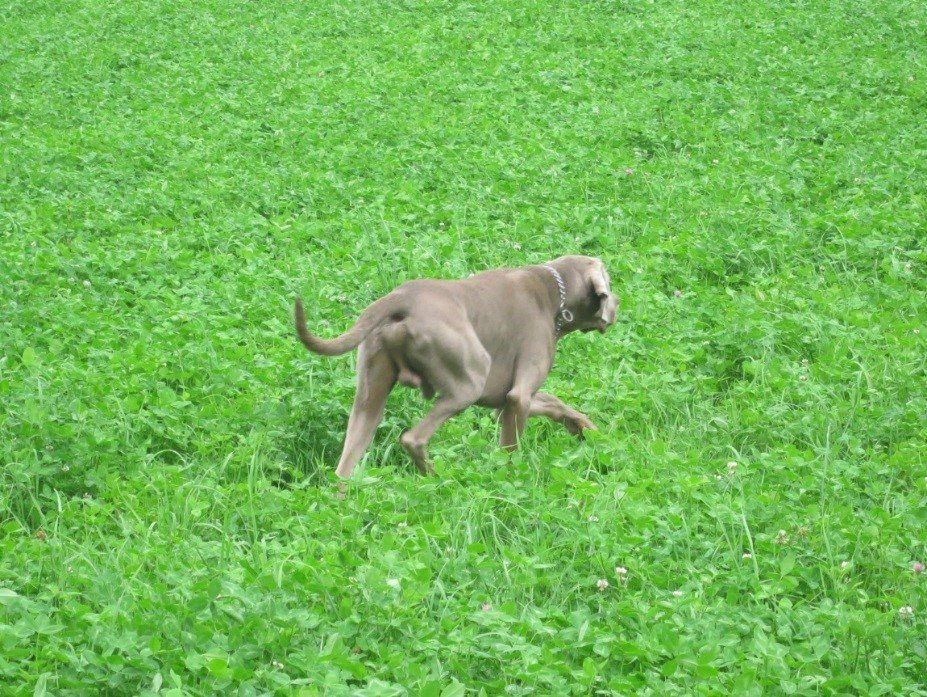 Zuerst durfte ich eine Nachsuche machen – das liebe ich – ist ja zuhause in der Schweiz auch meine Hauptaufgabe. Leider waren wir nach dieser Disziplin nur noch zu zweit – der andere Weimaraner hatte Hunger – hat wahrscheinlich nichts zum Frühstück bekommen!! Wir dislozierten dann wieder ins Revier auf die Felder und Federwildschleppen waren angesagt. Von Disziplin zu Disziplin wurde Frauchen nervöser – konnte das gar nicht verstehen, denn die kriti-schen Aufgaben hatte ich ja bestanden!! Am Schluss war noch Stöbern angesagt. Nachdem ich den ganzen Teil zweimal durchgestöbert und nichts gefunden hatte, blieb ich in der Nähe von Frauchen – nicht, dass sie noch allein nach Hause fährt und ich bin ja ein schlaues Kerlchen – muss meine Energie einteilen seit der Vergiftung von letztem Jahr!!